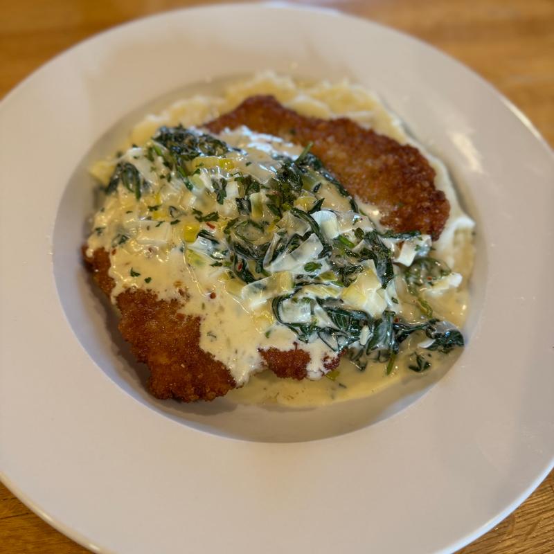 *Tuesday-Thursday only* Panko and potato chip crusted pork cutlet topped with creamed spinach & leeks over mashed potatoes.
