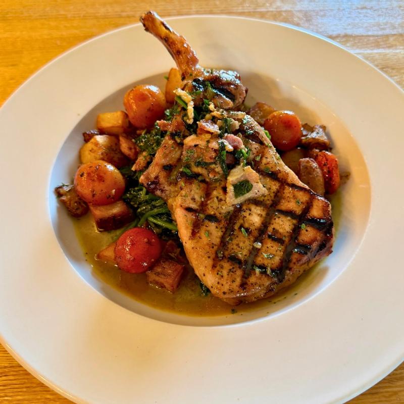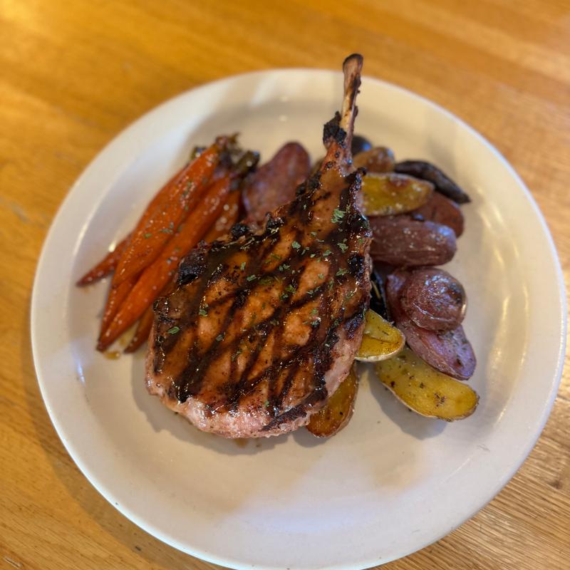 A 10 oz brown sugar brined bone in pork chop served with fingerling potatoes and maple bourbon glazed carrots.