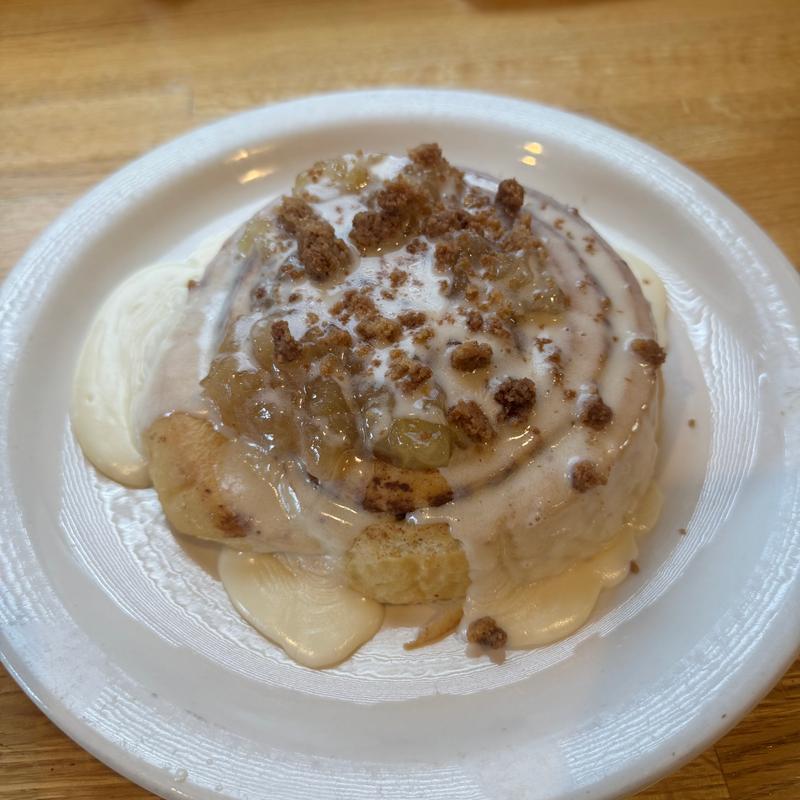 A warm cinnamon roll stuffed with apple pie filling topped with cream cheese frosting, caramel, and crisp topping.