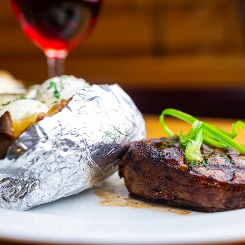An extremely tender 8 oz. USDA choice, bacon-wrapped beef tenderloin.