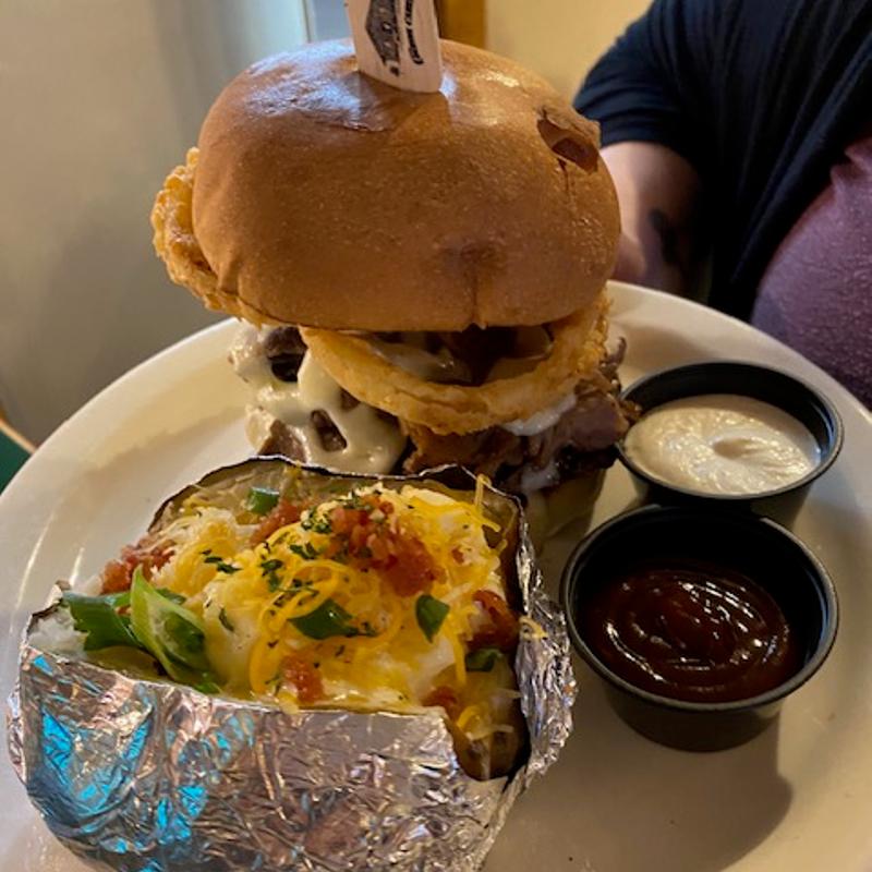 A ½ lb. Black Angus beef patty topped with thinly sliced prime rib, Swiss cheese, and onion rings on a brioche bun. BBQ sauce & horseradish mayo on the side.