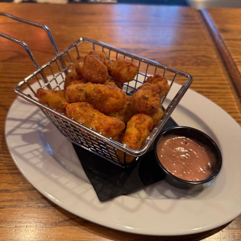 Garlic cheese curds, lightly fried and served with our house cranberry mustard.