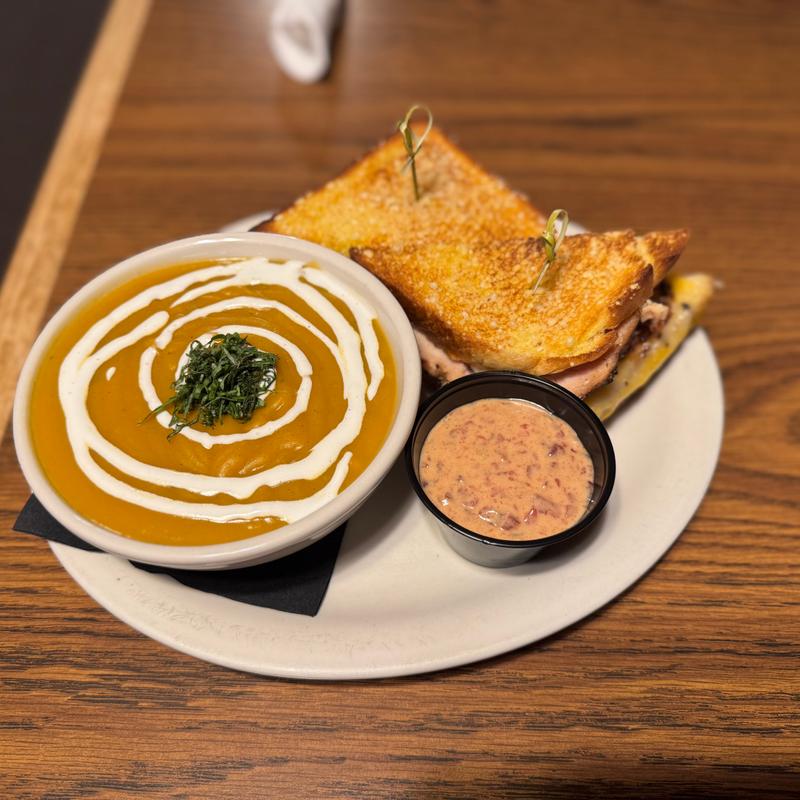 *Tuesday-Thursday only* House smoked turkey, thick-cut Texas toast with Gruyere, Swiss, and sharp cheddar cheeses. Served with Butternut Squash Bisque.